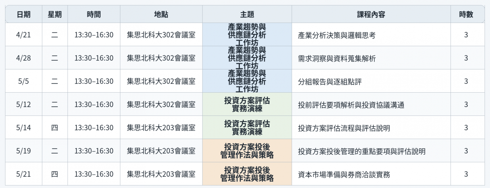 透過本課程辦理,預期加速潛力投資案件之發掘、篩選與推進,同時,也期待建立與搭配投資人一致之產業分析與投資判斷架構,降低案件評估落差,提升投資案件品質後續管理成效。